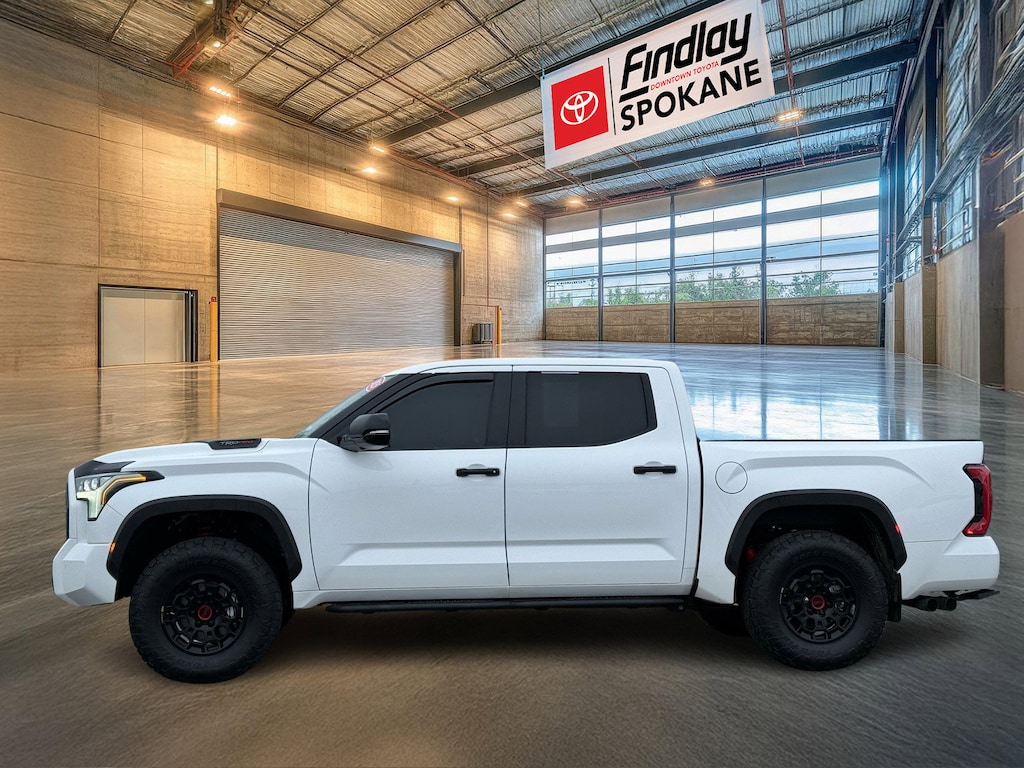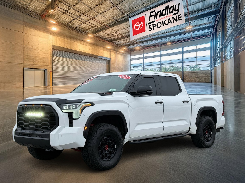 Findlay Downtown Toyota Spokane proudly presents this Toyota Tundra Hybrid with only 4538 miles. All of our cars are hand picked and inspected for your peace of mind. This Tundra Hybrid is equipped with the following options: Tundra Hybrid TRD Pro, 4D CrewMax, 3.4L V6, 10-Speed Automatic, 4WD, 12 Speakers, 3.31 Axle Ratio, 4-Wheel Disc Brakes, ABS brakes, Air Conditioning, Alloy wheels, AM/FM radio: SiriusXM, Apple CarPlay/Android Auto, Auto High-beam Headlights, Auto-dimming door mirrors, Auto-dimming Rear-View mirror, Automatic temperature control, Brake assist, Bumpers: body-color, Delay-off headlights, Driver door bin, Driver vanity mirror, Dual front impact airbags, Dual front side impact airbags, Electronic Stability Control, Emergency communication system: Safety Connect (10-year trial), Exterior Parking Camera Rear, Front anti-roll bar, Front Bucket Seats, Front Center Armrest, Front dual zone A/C, Front fog lights, Front reading lights, Front wheel independent suspension, Fully automatic headlights, Garage door transmitter: HomeLink, Heated & Ventilated Front Bucket Seats, Heated door mirrors, Heated front seats, Heated steering wheel, Illuminated entry, Knee airbag, Leather Shift Knob, Leather steering wheel, Low tire pressure warning, Memory seat, Navigation System, Occupant sensing airbag, Outside temperature display, Overhead airbag, Overhead console, Panic alarm, Passenger door bin, Passenger vanity mirror, Power door mirrors, Power driver seat, Power moonroof, Power passenger seat, Power steering, Power windows, Radio data system, Radio: Premium Audio w/JBL, Rear reading lights, Rear seat center armrest, Rear step bumper, Rear window defroster, Remote keyless entry, Security system, SofTex Seat Trim, Speed control, Speed-sensing steering, Split folding rear seat, Sport steering wheel, Steering wheel mounted audio controls, Tachometer, Telescoping steering wheel, Tilt steering wheel, Traction control, Trip computer, Turn signal indicator mirrors, Variably intermittent wipers, Ventilated front seats, Voltmeter, and Wheels: 18" x 8" Black BBS Forged Aluminum.
